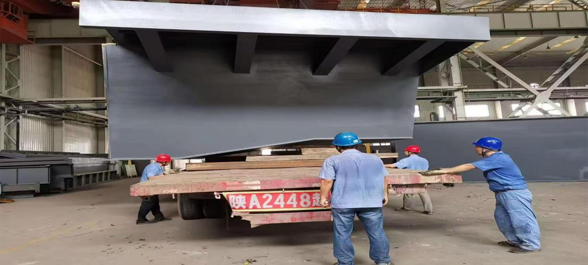 由于該項目鋼箱梁中的疊合梁數(shù)量較多,不僅內(nèi)部結(jié)構(gòu)復(fù)雜,而且外部形狀極不規(guī)則,裝車發(fā)運難度較大。為此,陜重公司的運輸公司,超前工作,在鋼箱梁的加工制作過程中,就提前深入到生產(chǎn)車間和現(xiàn)場,進行跟蹤,全面收集、匯總、計算鋼箱梁各部位的尺寸變化,再根據(jù)運輸?shù)能囆?,選用安全牢靠的鋼材,設(shè)計、制作運輸工裝,并首此采取了鋼箱梁"先在廠內(nèi)試運,確認運輸安全后,再正式裝車發(fā)運出廠"的安全運輸方案,確保了400多塊鋼箱梁的正常安全運輸。
